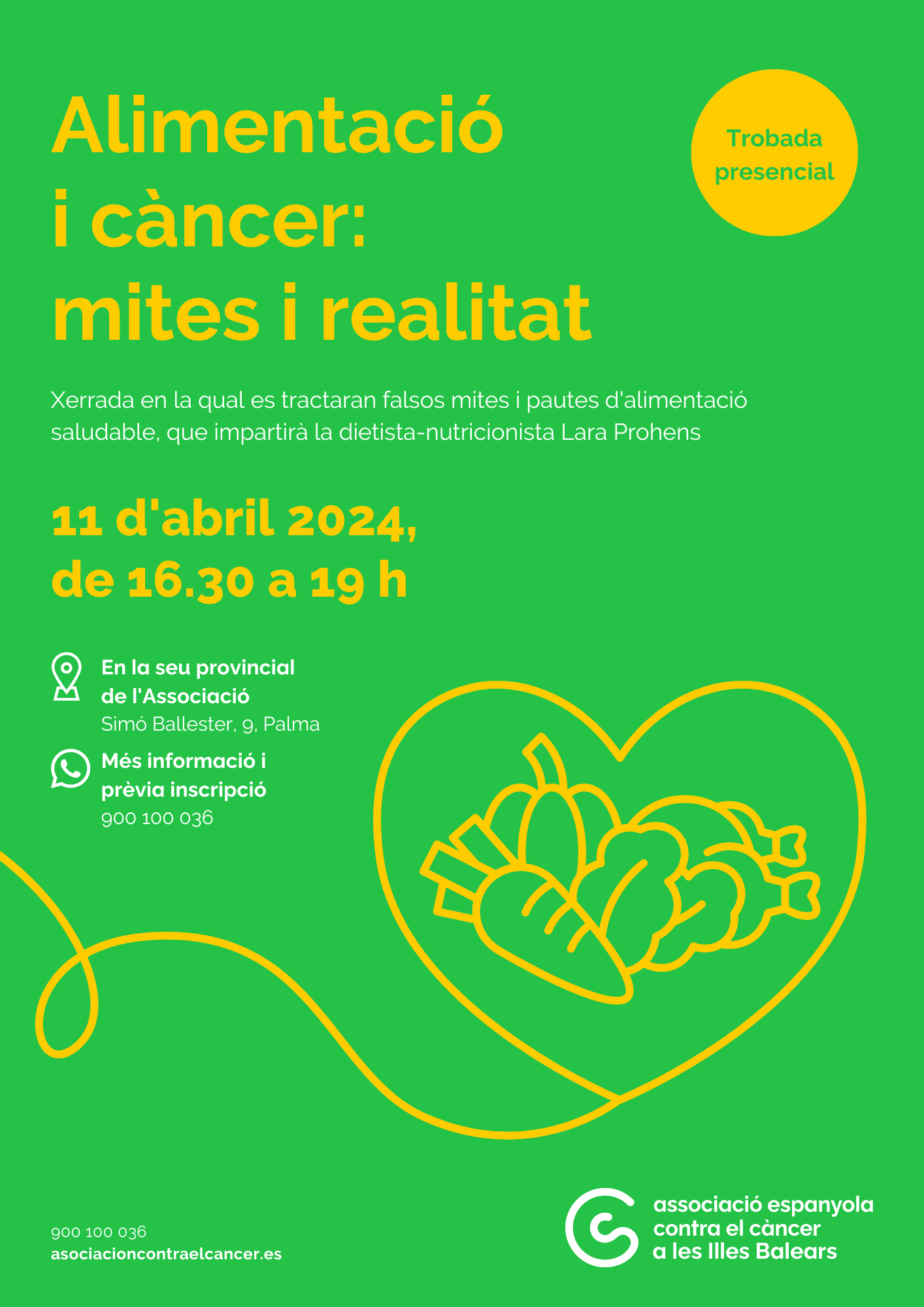 A Palma serà el 29 d'abril, de 10 a 12 h, en la seu provincial de l'Associació (Simó Ballester). Prèvia inscripció: paula.rodriguez@contraelcancer.es o 900 100 036.