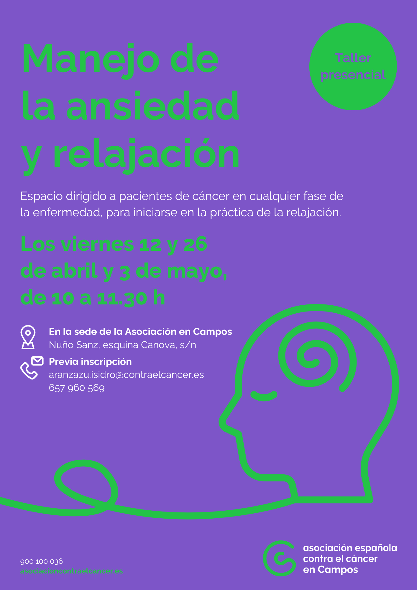 A Campos es durà a terme els dijous 11 i 18 d'abril, de 17 a 18.30 h, en la seu de l'Associació (Nuño Sanz, cantonada Canova, s/n). Prèvia inscripció: aranzazu.isidro@contraelcancer.es o 657 960 569.