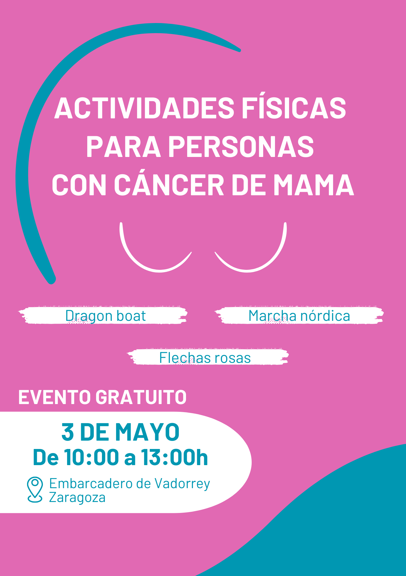 Enmarcado dentro de la IV Jornada Aragonesa de Humanización en cáncer de mama, Zaragoza acogerá el próximo 3 de mayo un EVENTO GRATUITO en el que profesionales sanitarios, federaciones deportivas, clubes deportivos y asociaciones que trabajamos contra el cáncer nos unimos para acercar a las personas que están pasando por un cáncer de mama diferentes actividades deportivas para mejorar su proceso oncológico.