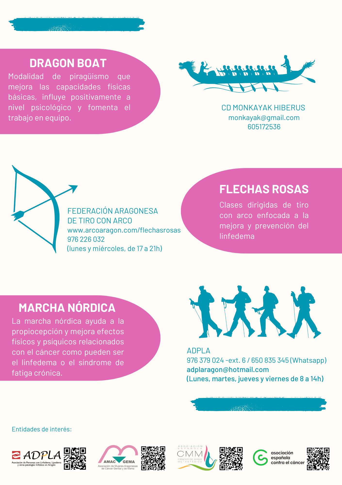 Los asistentes podrán practicar piragüismo de la mano del CD Monkayak Hiberus, tiro con arco con la Federación Aragonesa de tiro con arco y marcha nórdica a través de la Asociación de Personas con Linfedema, Lipedema y otras patologías linfáticas en Aragón ADPLA.