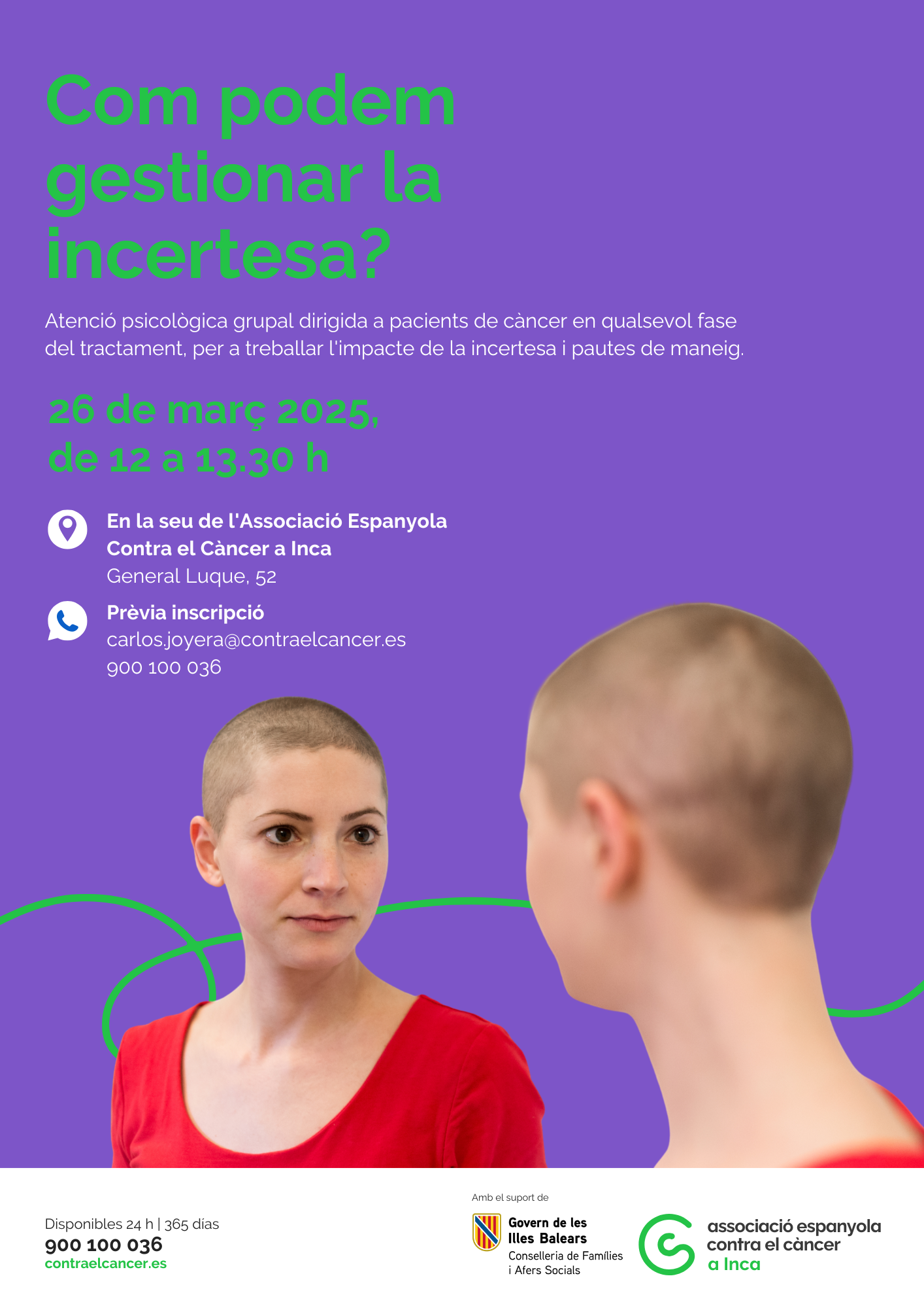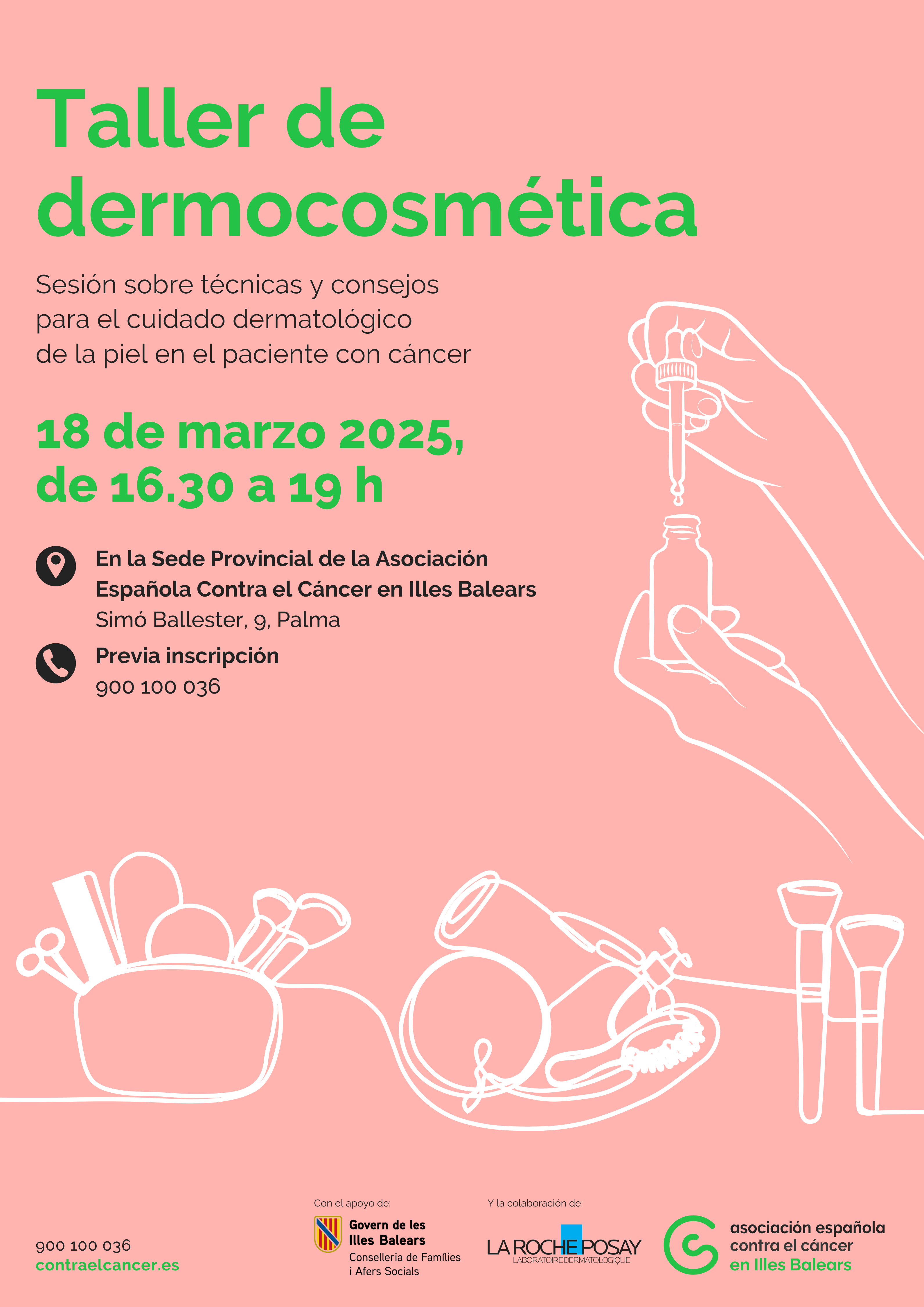 En Palma se llevará a cabo todos los lunes, del 17 de marzo al 14 de abril, de 9.30 a 11 horas, en la sede de la Asociación en Palma (Simó Ballester, 9). Previa inscripción: inmaculada.palma@contraelcancer.es o 900 100 036.