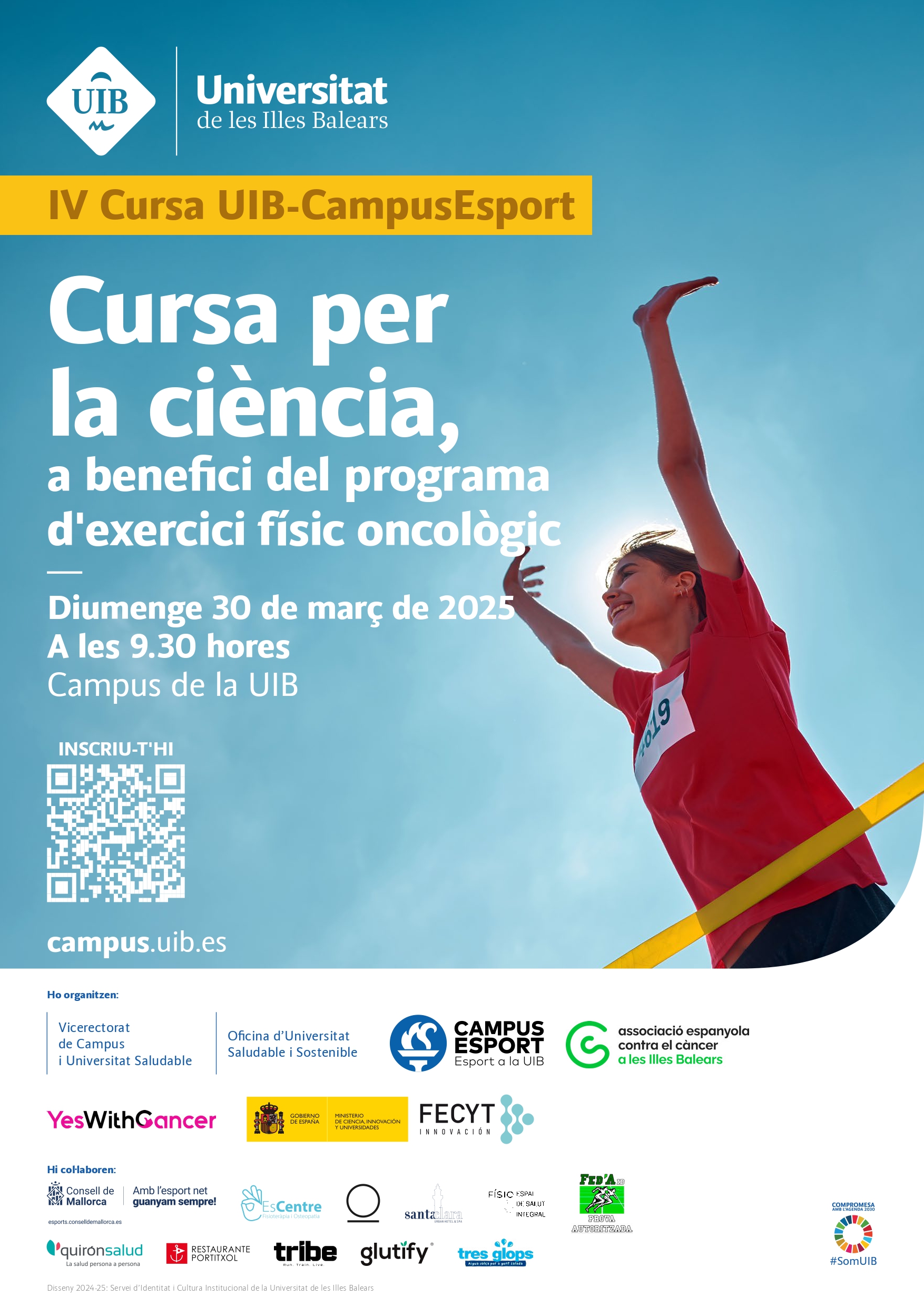 La IV Cursa UIB-CampusEsport "Carrera por la Ciencia, a beneficio del Programa de Ejercicio Físico Oncológico" tiene como objetivo fomentar el deporte y promover un estilo de vida saludable entre la comunidad universitaria y la sociedad en general.