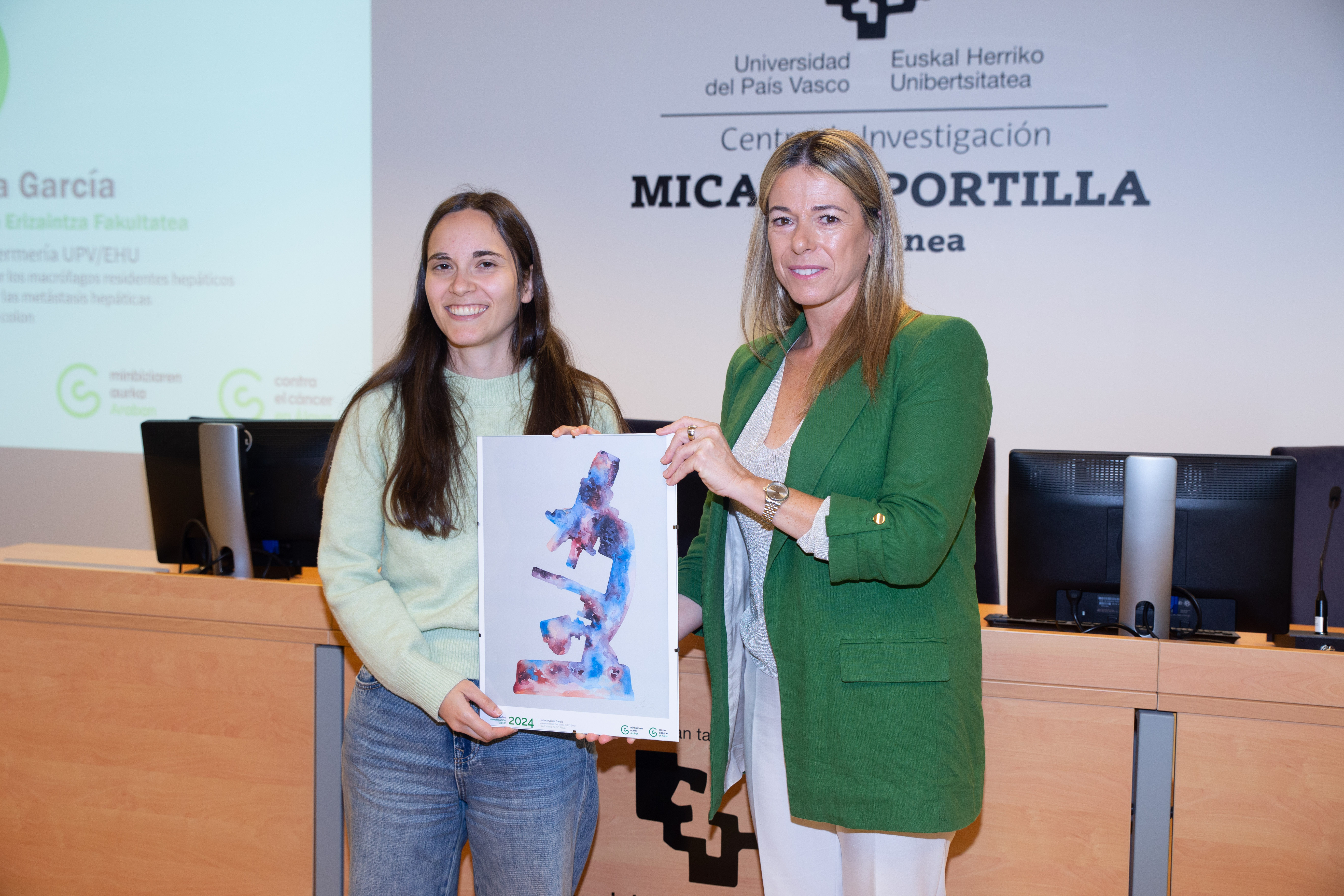 La joven investigadora Helena García ha recibido hoy de manos de la presidenta de la Asociación Contra el Cáncer en Álava, Miren Bilbao, una ayuda predoctoral a la investigación que asciende a 100.600 euros por 4 años. García, bajo la dirección del doctor Iker Badiola, desarrollará su tesis doctoral en torno a las metástasis hepáticas de cáncer de colon en la Facultad de Medicina y Enfermería de la Universidad del País Vasco UPV/EHU.