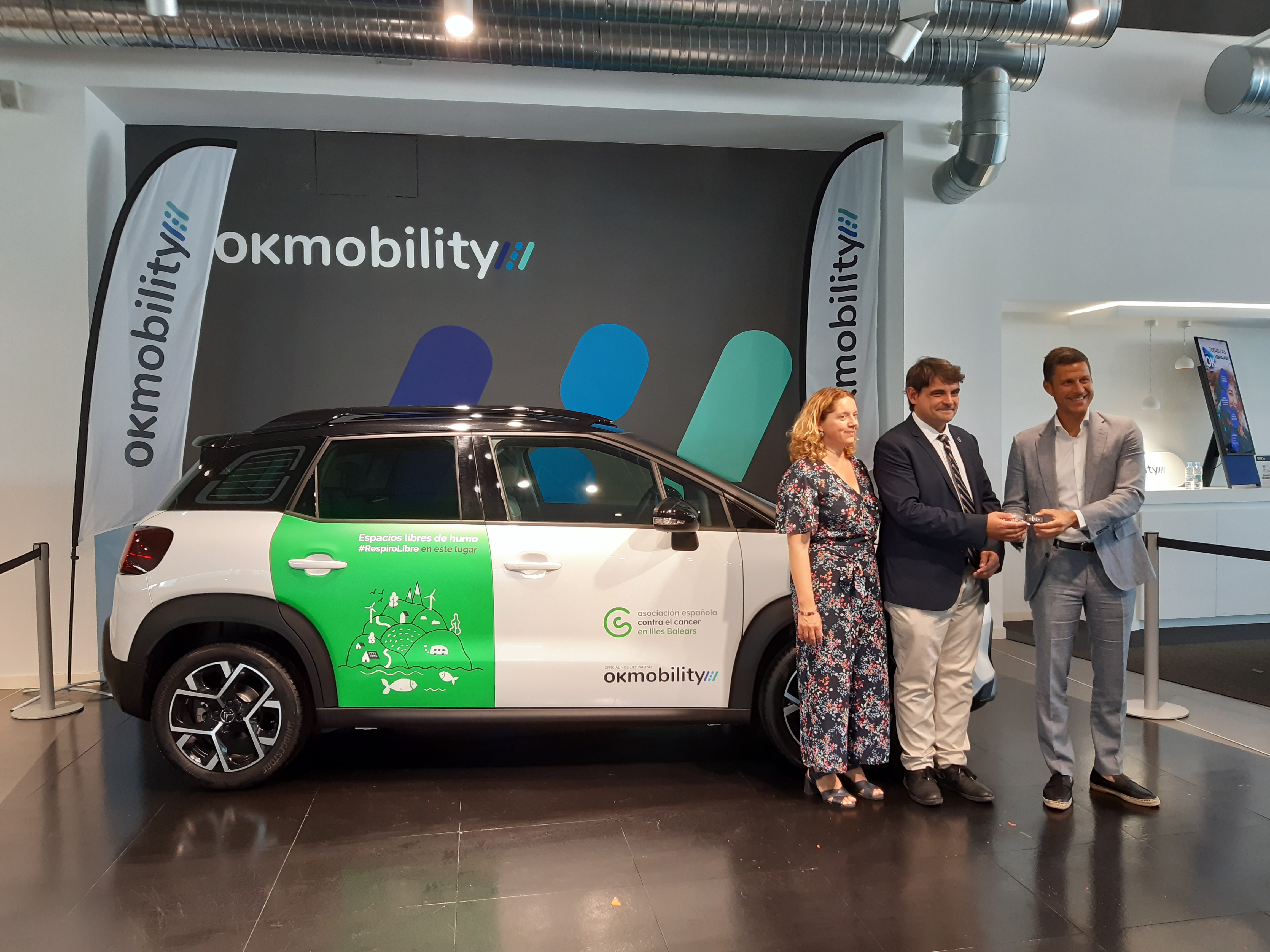 La campaña "Espacio Libre de Humo" es también protagonista del nuevo acuerdo de colaboración que la Asociación ha firmado con OK Mobility, que se convierte en la primera Empresa Activa Contra el Cáncer en Illes Balears. El vehículo cedido por OK y que utilizarán los profesionales de misión de la Asociación va rotulado con la imagen de la campaña #RespiroLibre.