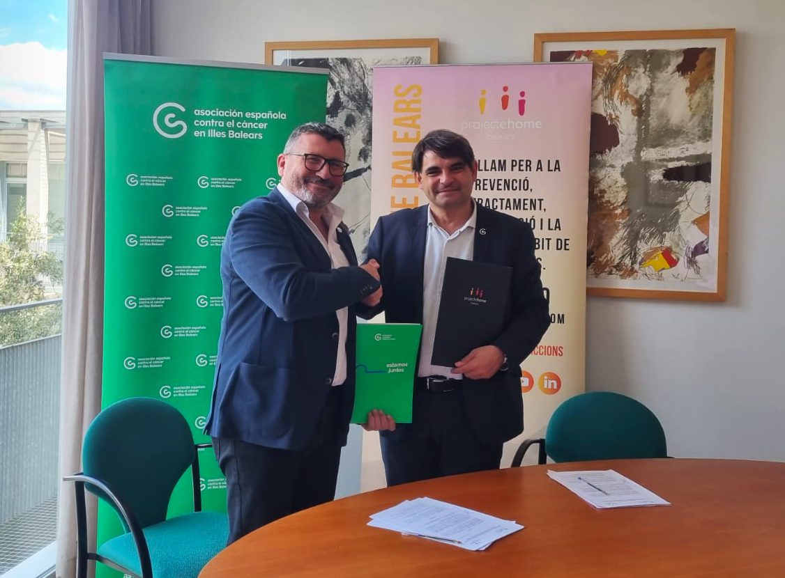 El presidente de la Asociación Española Contra el Cáncer en Illes Balears, Dr. José Reyes, y el presidente ejecutivo de la Fundación Projecte Home Balears, Jesús Mullor, han renovado el convenio de colaboración firmado entre ambas entidades en 2019 con el objetivo de llevar a cabo acciones de promoción de la salud entre profesionales y usuarios de la fundación. El convenio original tenía una duración de tres años, pero se vio interrumpido por la pandemia de la Covid-19.