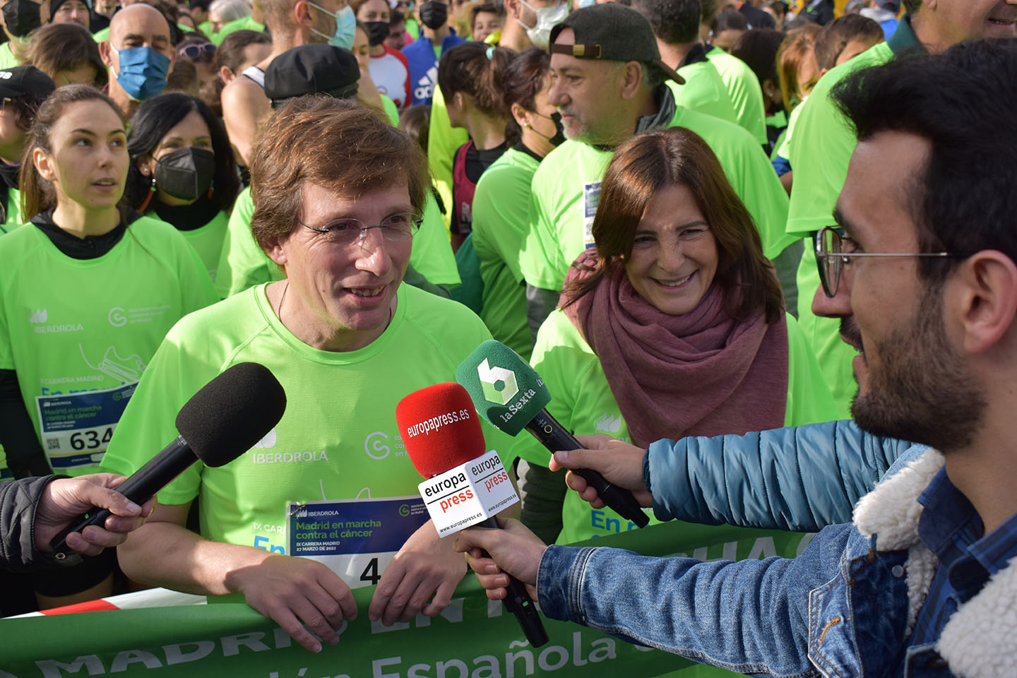 A pesar del adelanto horario de verano, los participantes en la distancia larga, de 10 kilómetros, llegaron puntuales a su cita, las 9 de la mañana, entre ellos el consejero de Sanidad, Enrique Ruiz, corredor habitual de esta prueba, que, además, fue el encargado del corte protocolario de la cinta de salida, a cuyo tradicional color verde se unió el azul y amarillo en apoyo a Ucrania. El consejero estuvo acompañado, entre otros, por la presidenta de la Asociación Española Contra el Cáncer en Madrid, Laura Ruiz de Galarreta; Alicia Martín, directora general de Deportes del Ayuntamiento de Madrid; y el locutor de la emisora de radio Cadena 100 Javi Nieves.