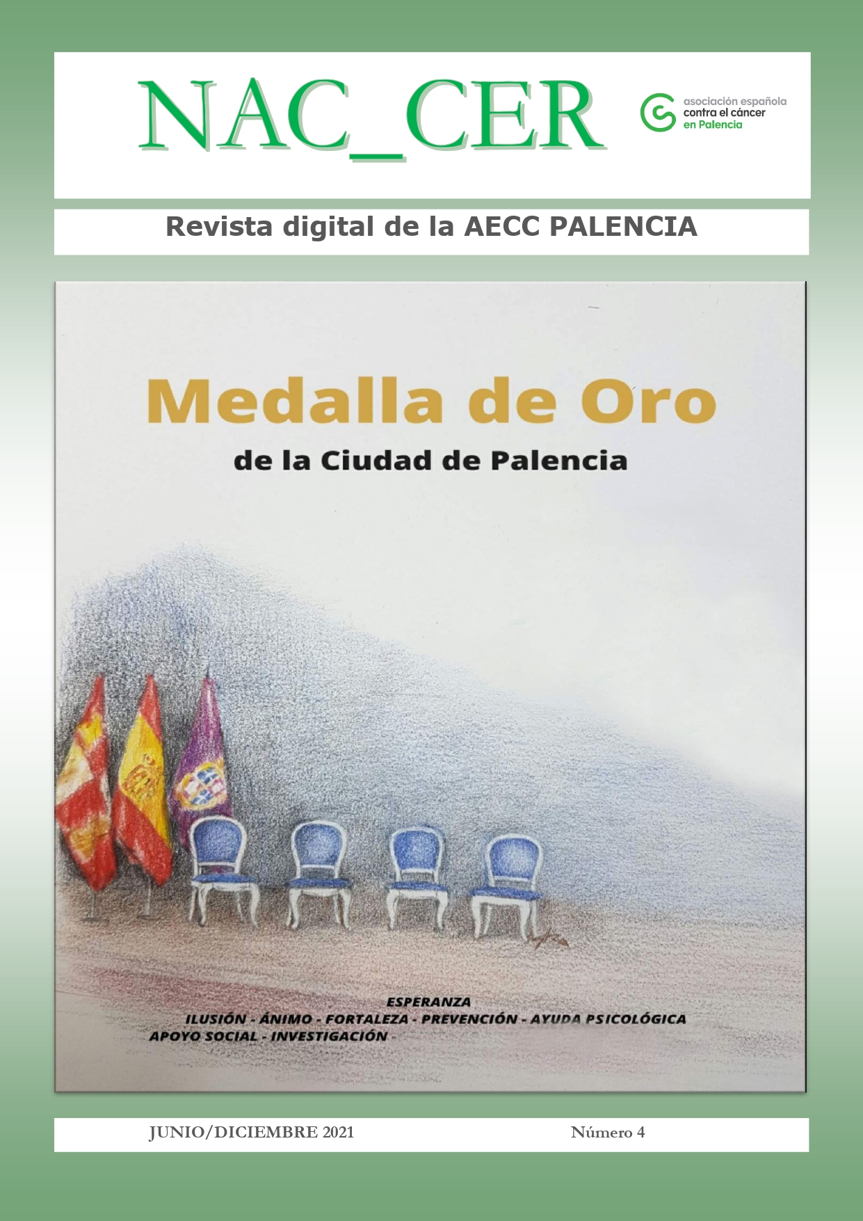 Palencia, diciembre 2021.- La Asociación Española Contra el Cáncer (AECC) en Palencia, publica el nuevo número de su revista Nac-Cer, bajo el título: "Medalla de Oro de la Ciudad de Palencia". Este semestre con especial orgullo por haber sido galardonados con la Medalla de Oro de la Ciudad de Palencia, además cuenta con interesantes artículos y reportajes de personas cercanas a la labor de la asociación.