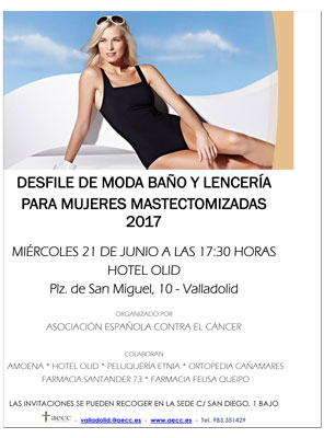 La AECC Valladolid celebrará el próximo 21 de junio el desfile de lencería y baño de la colección 2017 de Amoena para mujeres mastectomizadas en el Hotel Olid (plaza San Miguel, 10), a las 17.30h.