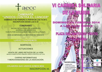 La Asociación Española Contra el Cáncer (aecc) en Santa Cruz de Tenerife es la entidad destinataria de dos eventos que se desarrollarán el próximo domingo 9 de febrero. Por un lado, la Junta Local de Candelaria de la aecc celebrará la Caminata Unidos Contra el Cáncer, que partirá desde la plaza de la Basílica de Nuestra Señora de Candelaria a las 10:30, continuando por la Avenida de Los Menceyes con regreso por la Avenida Marítima, de nuevo hasta la plaza. Las personas interesadas en participar en este solidario evento podrán inscribirse a partir de las 9:30 con una colaboración de 3 euros.