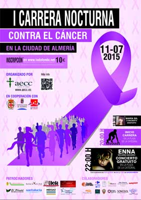 La Junta Provincial de Almería de la Asociación Española contra el Cáncer organiza la "I Carrera Nocturna Contra el Cáncer Ciudad de Almería" tendrá lugar el día 11 de julio 2015, a las 20:00 horas y terminará a las 21:00 horas, siendo UNA hora el tiempo máximo para la finalización de la prueba.