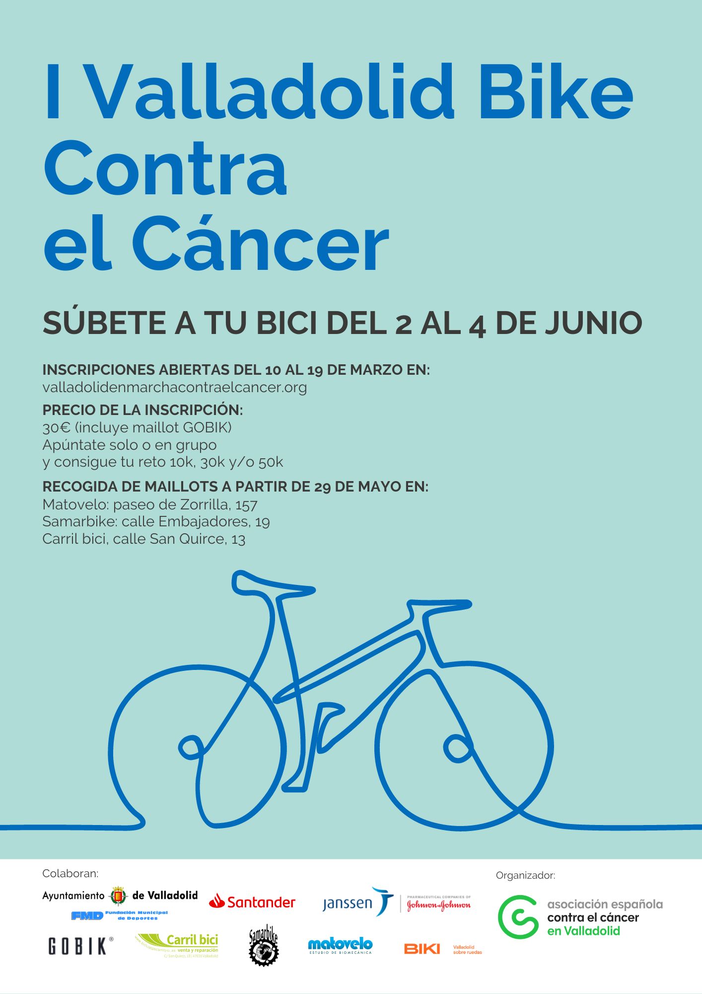 La Asociación Española Contra el Cáncer en Valladolid organiza la I Valladolid Bike Contra el Cáncer (del 2 al 4 de junio). Se trata de una iniciativa solidaria mediante una inscripción (30 euros) que incluye un maillot de la marca Gobik. El objetivo de la acción es fomentar los hábitos de vida saludables a través del deporte, concretamente del uso de la bici, y recaudar fondos que irán destinados íntegramente a cubrir los servicios de apoyo y acompañamiento al paciente y su familia, y proyectos de investigación de la Asociación en Valladolid.