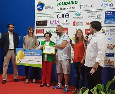 En la entrega de premios se encontraba Mili Quiroga, miembro de la Junta local de Móstoles de la AECC y María Maldonado, componente del Departamento de Juntas y Delegaciones Locales, que recibieron un talón de 1.800 euros de manos de Alejandro San Nicolás, presidente de Móstoles Empresa. A esta recaudación por las inscripciones del torneo se unieron 106 euros de la hucha instalada al efecto durante la jornada, que concluyó con un sorteo de regalos de todo tipo, desde conjuntos y raquetas de pádel a estancias en casas rurales, pasando por cenas en establecimientos colaboradores y complementos.