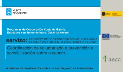 A aecc Pontevedra vense de beneficiar dunha subvención para o desarroio dun proxecto de coordinación do voluntariado e prevención e sensibilización sobre o cancro da Xunta de Galicia a través do Fondo Social Europeo no ámbito do Programa Operativo de Emprego Xuvenil. Esta subvención conleva a contratación dun Psicólogo durante 6 meses para o desenvolvemento da citada actividade.