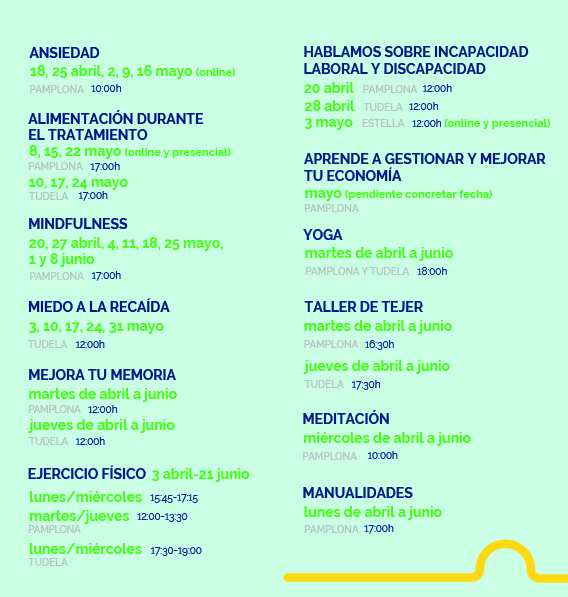 Para reservar plaza en cada uno de ellos podéis llamar al 948 212 697 o escribir un mail a psicosocial.navarra@contraelcancer.es.