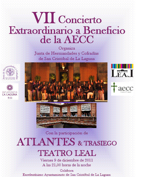 La aecc en Santa Cruz de Tenerife celebrará el próximo viernes 9 de diciembre el VII Concierto Extraordinario organizado por la Junta de Hermandades y Cofradías de San Cristóbal de La Laguna. En esta edición actuarán los grupos Atlantes y Trasiego. El evento tendrá lugar en el Teatro Leal y comenzará a las 21:00 horas.