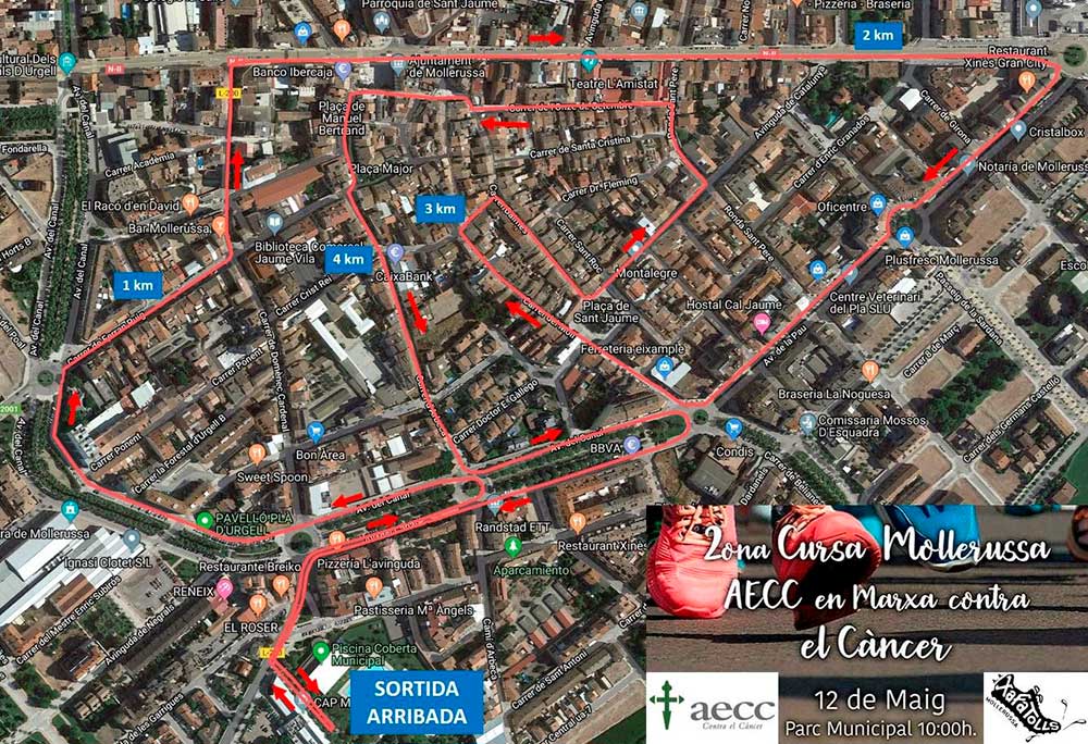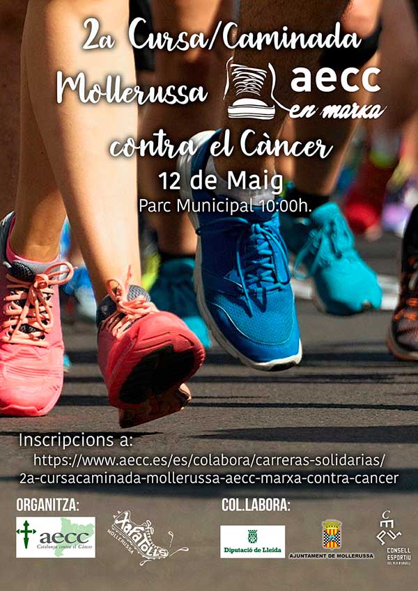 El proper dia 12 de Maig de 2019 la Junta Local de l’associació contra el càncer de Mollerussa amb la col·laboració de la resta de juntes de l’aecc del Pla d’Urgell duran a terme la 2a cursa/caminada Mollerussa aecc en marxa contra el càncer juntament amb el grup atlètic Xafatolls de Mollerussa.