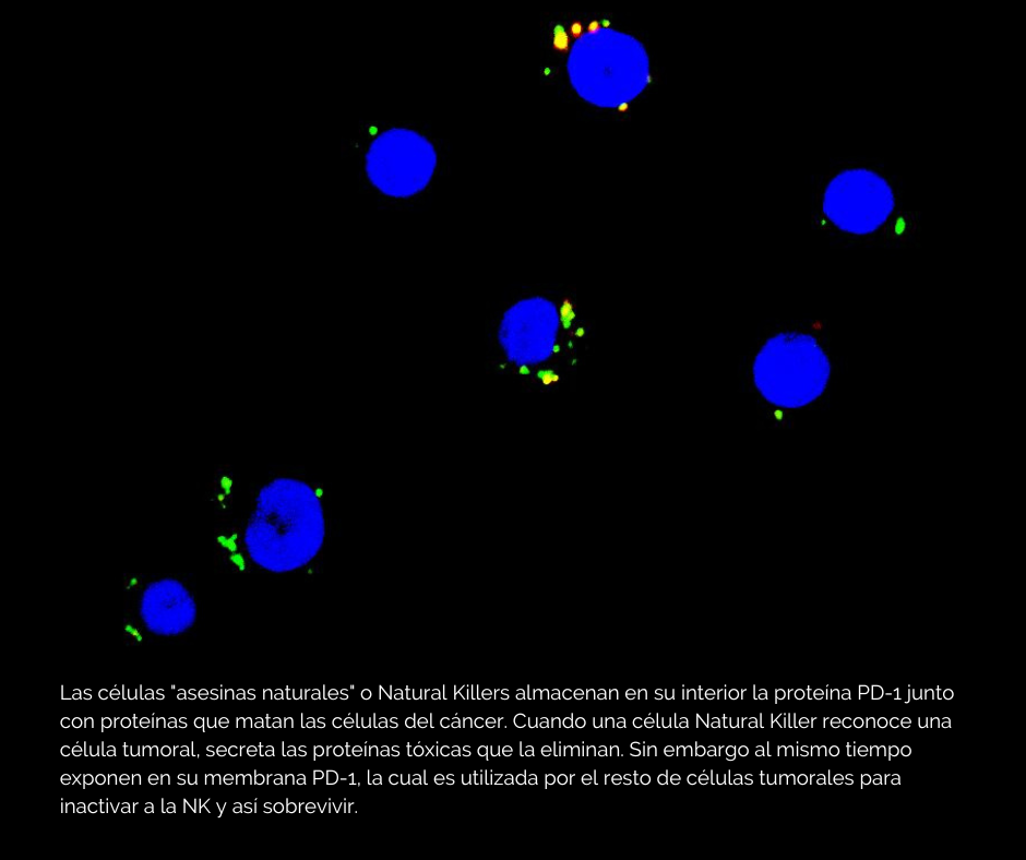En concreto, el estudio se ha centrado en un tipo de células del sistema inmunitario llamadas células “asesinas naturales” o Natural Killers, capaces de eliminar a las células tumorales. Los investigadores han confirmado que estas células contienen una proteína llamada PD-1 que las impide “ver” a las células tumorales y por eso en muchas ocasiones no son reconocidas ni destruidas. Tener en cuenta este descubrimiento en el diseño de inmunoterapias basadas en las células Natural Killer y combinarlas así con fármacos que actúen contra PD-1, permitirá que estas células reconozcan y eliminen a las células tumorales más eficazmente. Por tanto, este avance representa una nueva estrategia que podría mejorar la eficacia antitumoral los tratamientos de inmunoterapia y favorecer la respuesta de los pacientes.