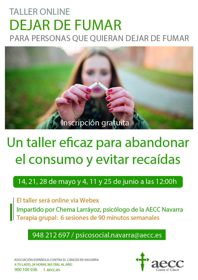 Dejar de Fumar es fácil si sabes cómo hacerlo. Por eso en nuestros talleres online gratuitos para Dejar de Fumar, dirigidos a personas adultas que deseen liberarse de esta adición, os facilitaremos los pasos necesarios a seguir en el proceso de abandono del consumo de cigarrillos y os daremos trucos para mantener la conducta abstinente, disminuyendo así la probabilidad de recaídas. Puedes inscribirte en los talleres aquí: