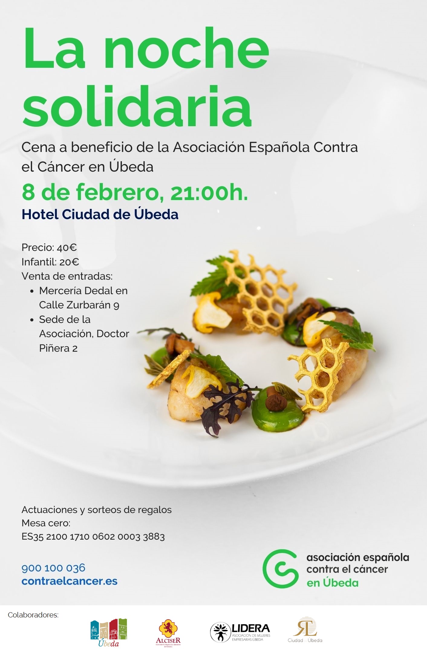 El próximo sábado 8 de febrero celebraremos la XXII edición de La Noche Solidaria Contra el Cáncer en Úbeda. Será a partir de las 21 h en el Hotel Ciudad de Úbeda, donde disfrutaremos de un magnífica bienvenida y, a continuación, se degustará el menú solidario. Una velada en la que no faltará actuaciones, música en directo, fotomatón solidario, sorteo de fantásticos regalos y muchas sorpresas más.