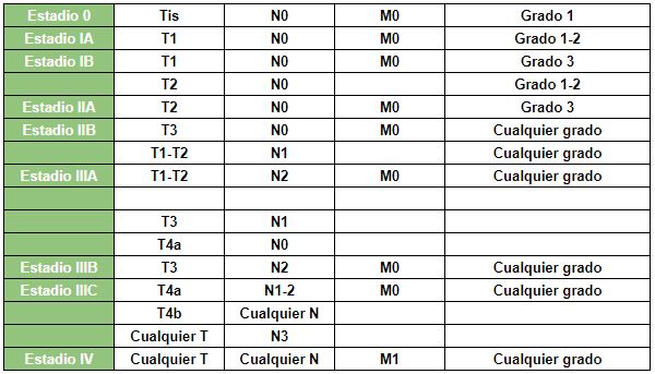 La división por estadios tiene en cuenta además si se trata de un carcinoma escamoso o un adenocarcinoma.