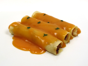 Cubrir los canelones con la salsa y presentar. Se puede decorar con un poquito de albahaca o menta picada o en hojas.