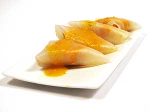 - Blanquear las cebollas tiernas sin que pierdan color y cortarlas por la mitad.