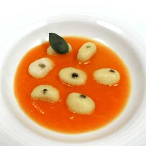 - Pelar las zanahorias y cortarlas en trozos. Ponerlas a hervir en agua y sal durante unos 10 minutos aprox., hasta que estén tiernas. Escurrirlas y triturarlas con la ayuda de un poco de agua mineral (la cantidad de agua para aligerar el puré dependerá de lo tiernas que sean las zanahorias). Ha de quedar un puré fino y ligero. Reservar.