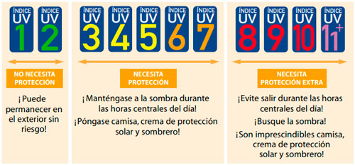 En España, en la península, los índices de radiación ultravioleta son altos, encontrado niveles bajos (1 y 2) en muy pocos meses del año (invierno sobre todo) y a muy pocas horas del día (muy temprano por la mañana). En Islas Canarias y Baleares son mayores, por lo que tenemos que siempre estar atentos a protegernos del sol, teniendo en cuenta que las horas de máxima radiación son entre las 12 y las 6 de la tarde.